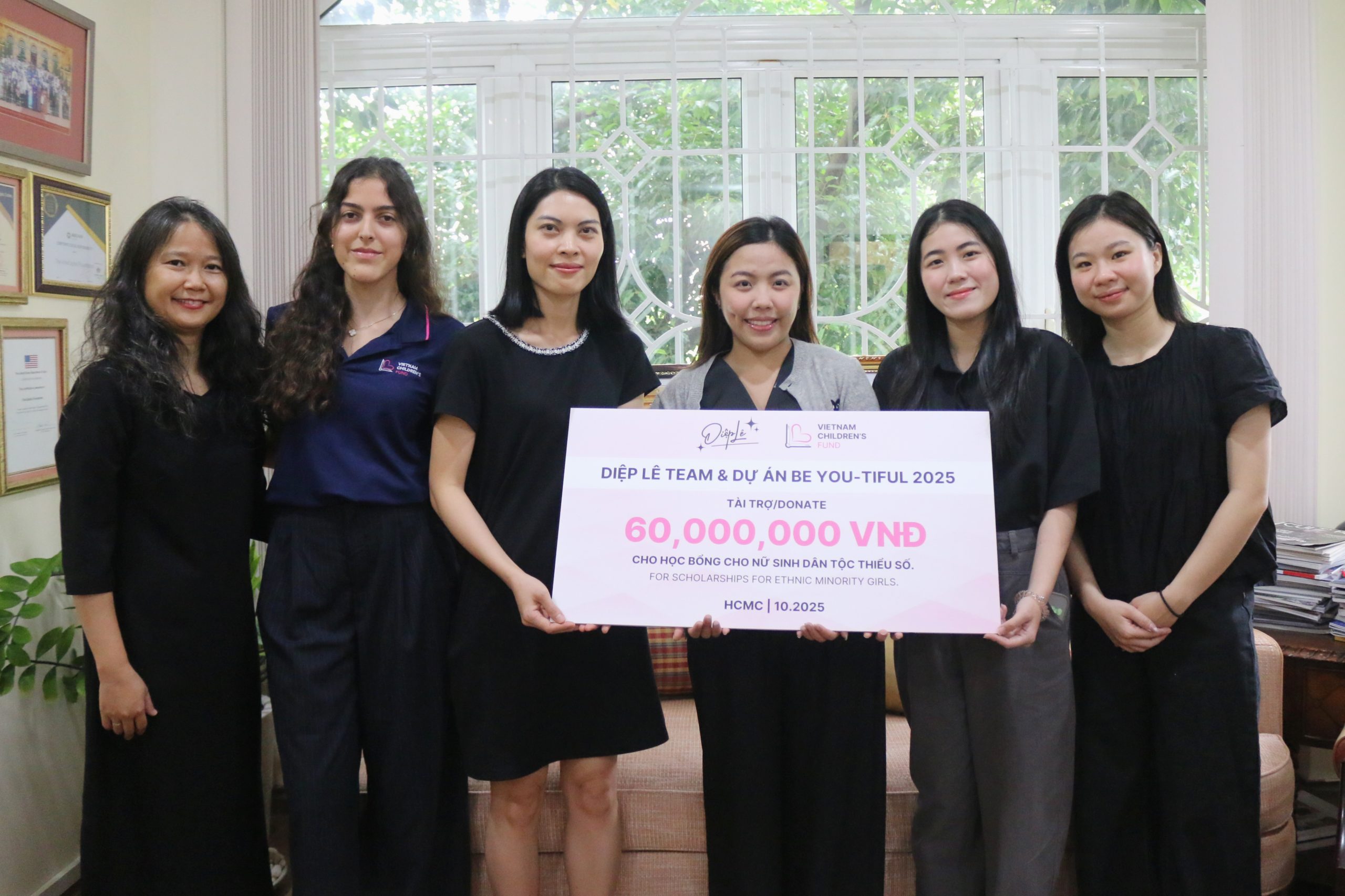 On October 9, 2025, Diep Le Team and the BE YOU-TIFUL 2025 project donated 60,000,000 VND to Vietnam Children’s Fund Social Enterprise to support scholarships for ethnic minority female students.