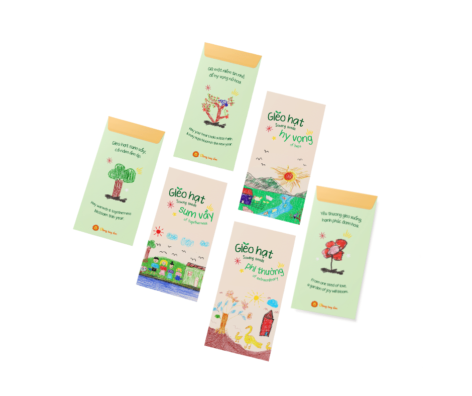Set of 6 lucky money envelopes with 6 different seeds symbolizing New Year wishes full of love and hope. Each design is a separate seed-sowing message, expressed through creative and meaningful drawings by children. Moreover, this set is a small gift containing great joy on the first day of the year.